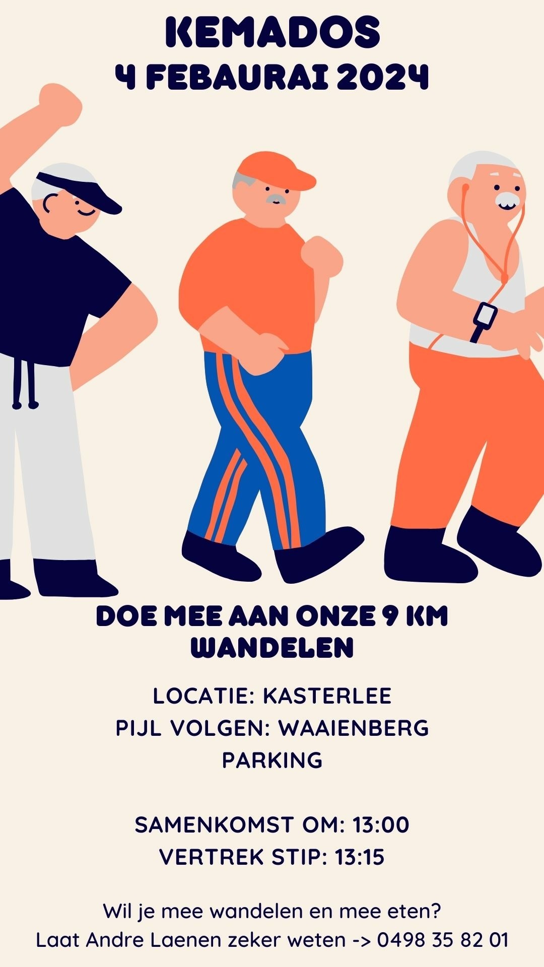 Doe mee aan onze 9 km wandeling! Locatie: KasterleePijl volgen: Waaienberg parking Samenkomst om 13:00Vertrek tijdstip: 13:15Wil je mee wandelen en mee eten? Laat Andre Laenen zeker iets weten -> 0498 35 82 01