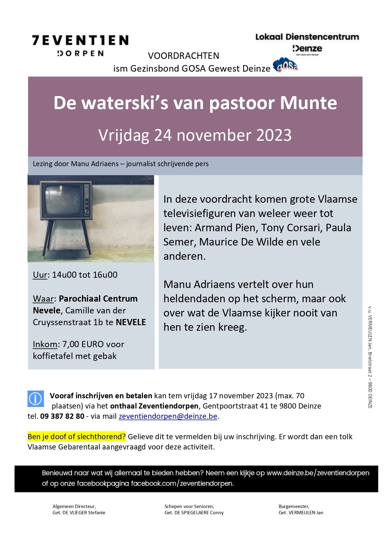 In deze voordracht komen grote Vlaamse televisiefiguren van weleer weer tot leven: Armand Pien, Tony Corsari, Paula Semer, Maurice De Wilde en vele anderen. Manu Adriaens vertelt over hun heldendaden op het scherm, maar ook over wat de Vlaamse kijker nooit van hen te zien kreeg. Uur: 14u00 tot 16u00 Waar: Parochiaal Centrum Nevele, Camille […]