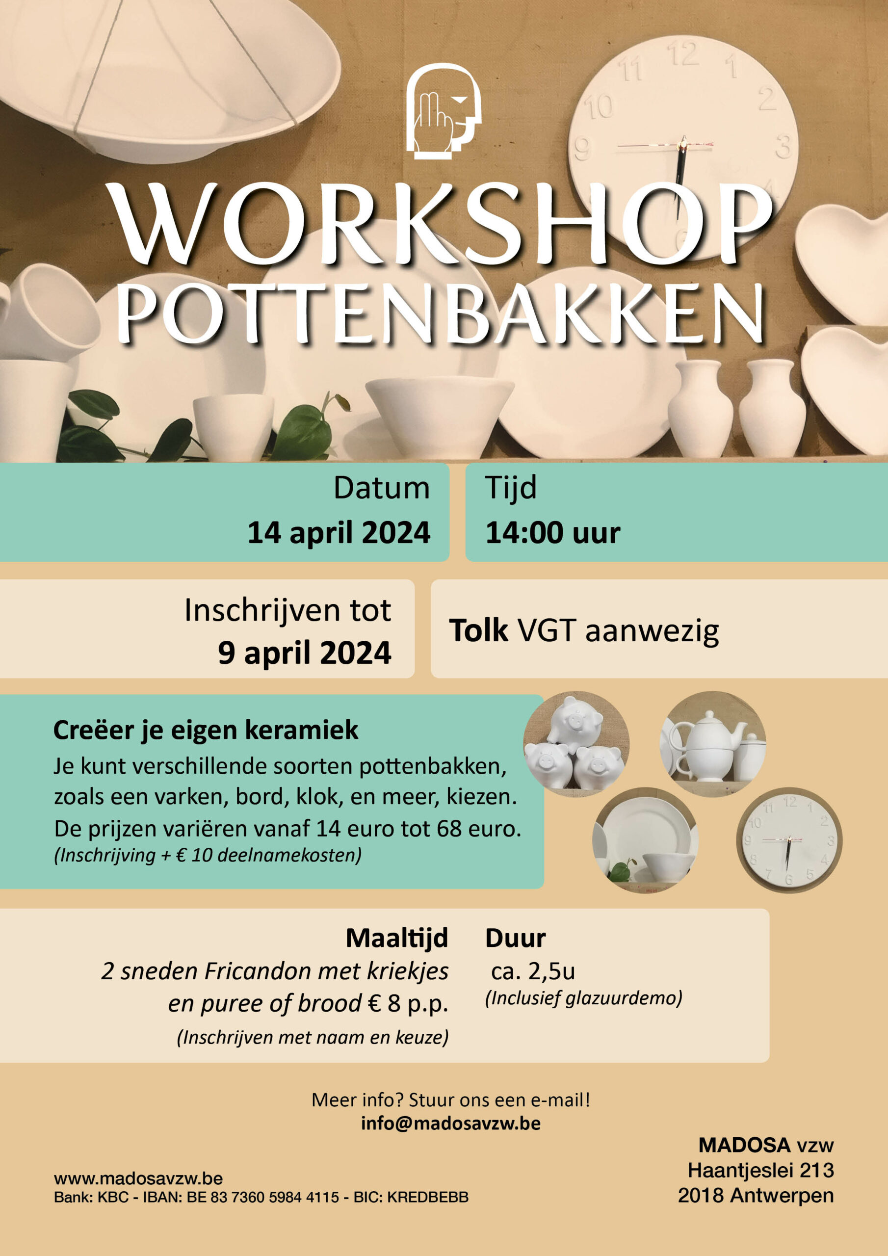 Madosa vzw organiseert op zondag 14 april 2024 workshop pottenbakken. Je kunt verschillende soorten pottenbakken. De prijzen variëren van 14 euro tot 68 euro + 10 euro deelnamekosten. Daarna kunnen […]