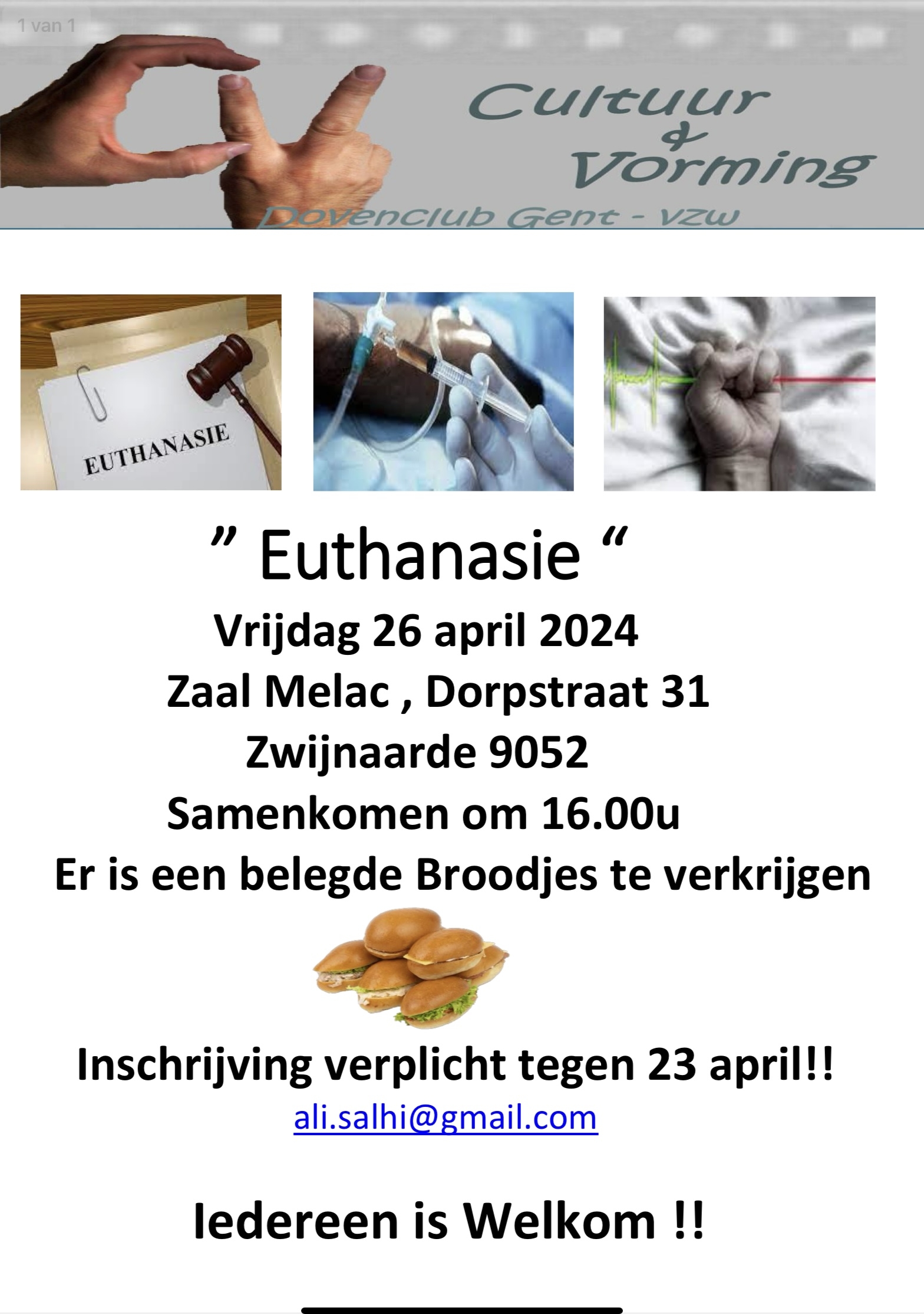GTG Cultuur x Vorming organiseert een lezing “Euthanasie“ op vrijdagavond 26 april om 17.30u in OC Melac, Zwijnaarde 9052. Iedereen welkom, inschrijven verplicht via ali.salhi@gmail.com.