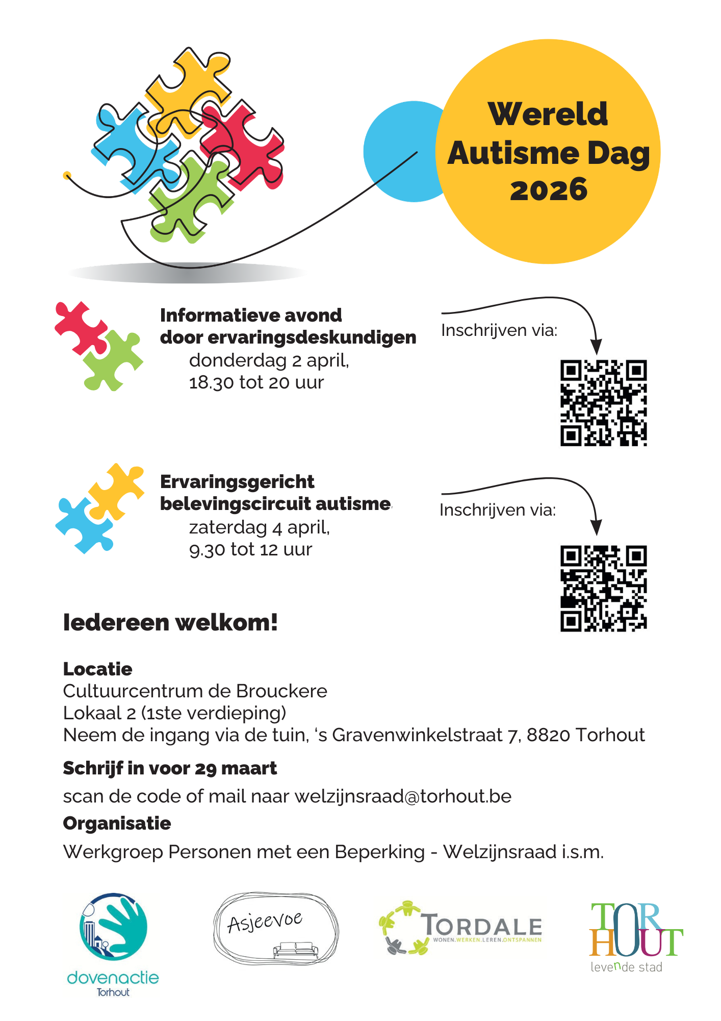 Op 2 april is het Wereld Autisme dag. De Welzijnsraad (Stad Torhout) organiseert daarom een informatieavond met ervaringsdeskundigen aan het woord op 2 april én een ervaringsgericht belevingscircuit op 4 april. Inschrijven voor 29 maart via de qr-codes op de flyer of via e-mail naar welzijnsraad@torhout.be. Tolken Vlaamse Gebarentaal aanwezig. Ingang via de tuin De […]